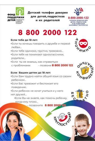 8 800 2000 122 или 124 - единый общероссийский номер детского телефона доверия - просто позвони в трудную минуту. Служба детского телефона доверия работает круглосуточно, анонимно и бесплатно, с домашнего и мобильного телефонов. Если линия занята, позвони в другое время. Будь настойчив в решении своих проблем.